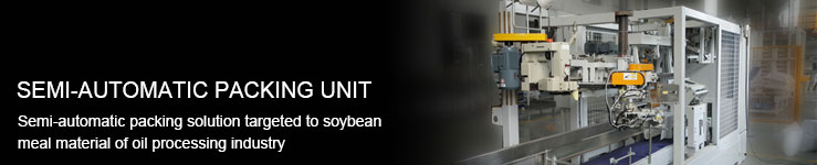 | Aiming at the packing needs of soybean meal material in oil processing industry, by referring to similar applications of the foreign counterparts and taking the top-grade products of global packing industry as benchmark,the semi-automatic packing unit made by Kaiwei Company with its utmost efforts is characterized by small footprint, stable and reliable operation etc. Followed by manual bag handling and opening, the subsequent actions such as bag attaching, bag opening trimming, heavy bag compaction, bag clamping and transfer, edge folding, label conveying, bag stitching etc. are automatically implemented by the semi-automatic packing unit. |